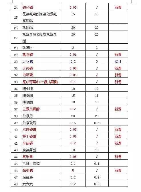2016版限量标准规定了48项农药在茶叶中的限量要求,相比2014版标准限量要求增加了20项。除新增了20项农药残留限量外,新版标准中还对灭多威的限量要求进行了修订,由2014版的3mg/kg降为2016版的0.2mg/kg。
